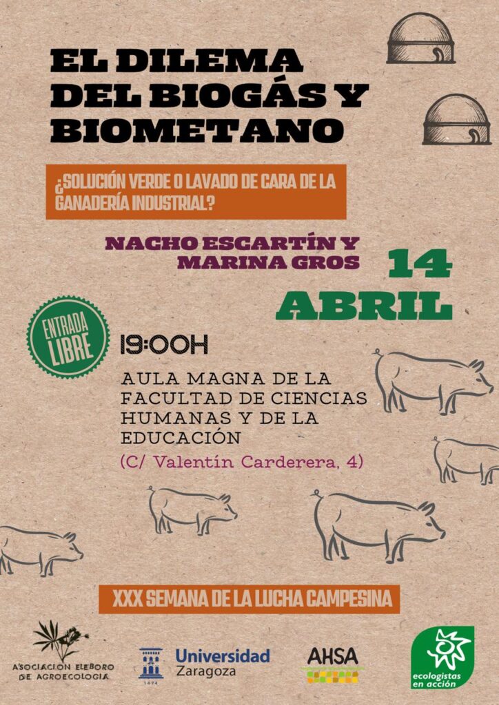 • Huesca (Martes 14 de abril, 19:00h): Estaré con Marina Gros en el Aula Magna de la Facultad de Magisterio hablando sobre biometano y ganadería industrial. ¡Os espero allí!